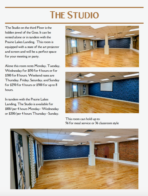 We are so excited to have another phenomenal space available for your events! The Studio on the third floor is the hidden jewel of the Goss. It can be rented alone or in tandem with the Prairie Lakes Landing. This room is equipped with a state of the art projector and screen. It will be a perfect space for your meeting or party.